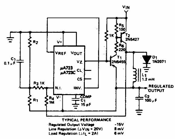 Usando o conhecido circuito integrado 723, este circuito fornece uma tensão de saída conforme indicado junto ao diagrama, dependendo dos componentes usados. O transistor de potência determina a corrente devendo ser dotado de radiador de calor.