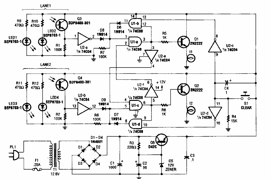A finalidade deste circuito é indicar qual de dois carros cruza a linha de chegada em primeiro lugar em uma autopista de autorama. O circuito é de uma Popular Electronics dos anos 80.