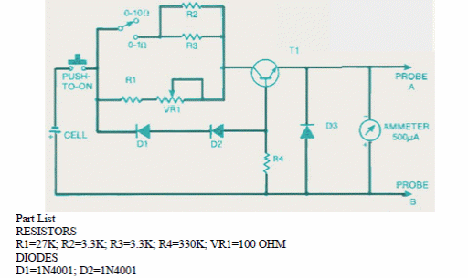 Este circuito foi obtido numa documentação inglesa recente. O circuito usa um microamperímetro de 500 uA como indicador. A faixa de indicação é de 0 a 10 ohms.