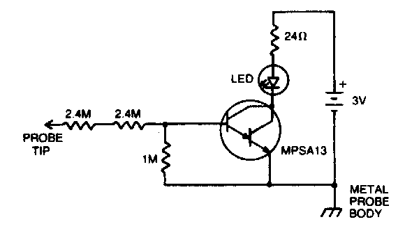 Este circuito para a rede de alimentação usa um LED e um transistor para detectar o polo vivo. O circuito exige resistores de alto valor para obtenção de segurança.
