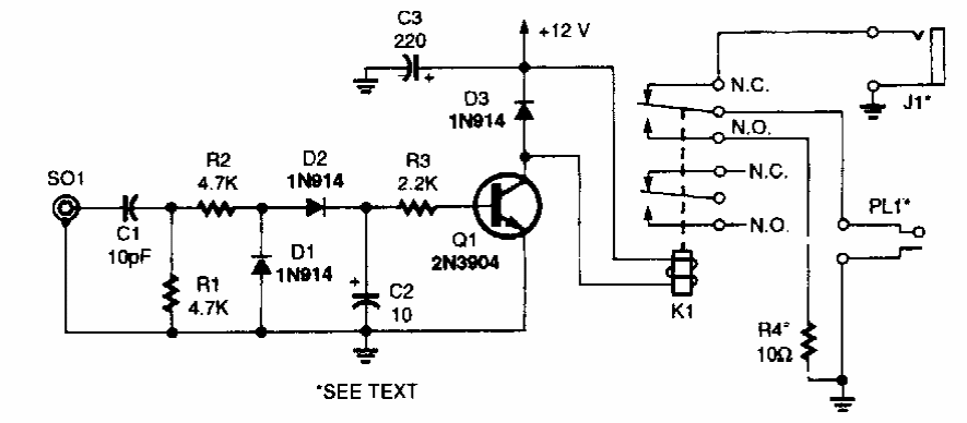 Este circuito foi encontrado numa Popular Electronics dos anos 90. Sua finalidade é desativar a saída de um receptor de FM ou VHF entre estações, evitando a reprodução do chiado.