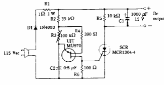 Esta fonte de alimentação sem transformador foi encontrada numa antiga documentação americana. Ela faz uso de um SCR para chaveamento. A corrente é de 100 mA e a tensão de 10 a 15 V.