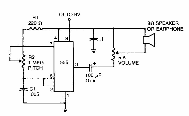 Encontramos este circuito gera sinais de 200 Hz a 62 kHz, podendo ser usado para repelir mosquitos muriçocas e pernilongos. O circuito pode ser alimentado desde 2 pilhas pequenas até bateria de 9 V.