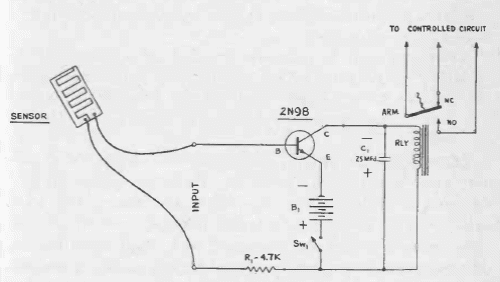 Este circuito simples foi encontrado numa documentação dos anos 50. O transistor é de germânio, mas podem ser usados equivalentes modernos. A alimentação é de acordo com a tensão do relé.
