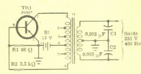 Este circuito de inversor de tensão foi obtido numa Eletrônica Popular de junho de 1967. As características do transformador não foram dadas. O transistor é de potência da época.