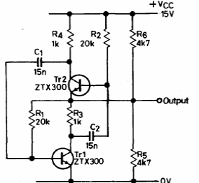 Este circuito foi encontrado num manual de transistores da Ferranti de 1974. A frequência é dada pelos capacitores, que podem ser alterados.