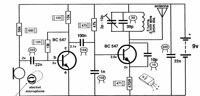 Encontrado numa documentação australiana de 1991, este circuito era vendido em kit na época. Trata-se de um pequeno transmissor de FM com configuração muito comum, encontrada também em outros projetos deste site.