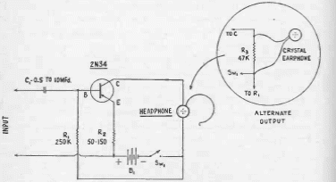 O circuito mostrado na figura é de um manual de transistores de 1956. Ele mostra como utilizar fone magnético e de cristal sendo válido para a maioria dos tipos de transistores de uso geral.