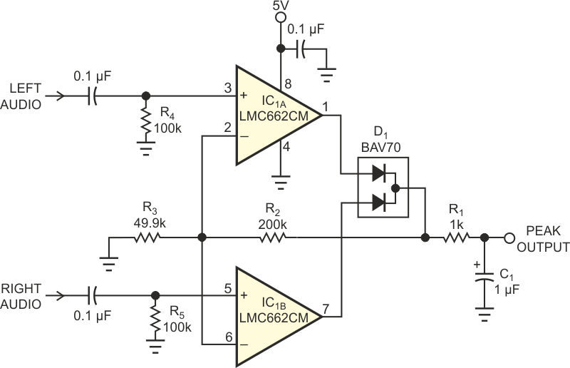 Este circuito se baseia no LMC662 da Texas Instruments, tendo por função monitorar os picos de áudio de um sistema estéreo baseado em computador. O circuito é para linhas padronizadas de 200 mVrms sendo alimentado por 5V não simétrico.