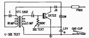 O transistor CK722 usado neste circuito é um dos primeiros tipos comerciais do mundo. A publicação é de 1954 e a frequência dada por C que pode ter valores entre 10 e 100 nF.