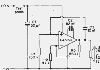 Este circuito com o amplificador operacional CA3130 foi encontrado numa documentação de 1977. O circuito não precisa de fonte simétrica. Ele gera um tom de áudio quando encontra continuidade em um componente ou circuito.