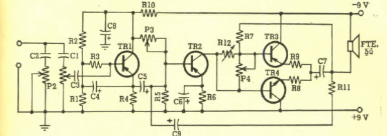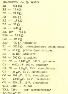 Este amplificador é de uma Eletrônica Popular de maço/abril de 1969. Os componentes são da época e a potência da ordem de 1,5 W com alimentação de 9 V.
