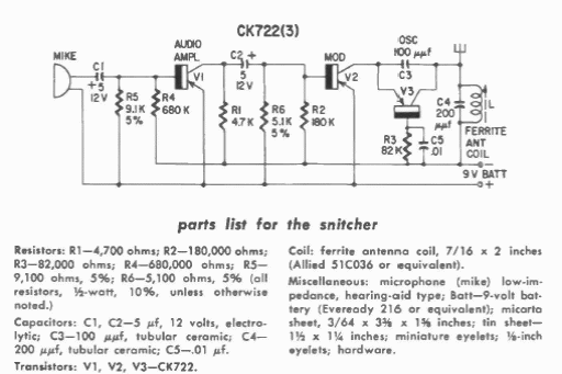 Este é o nome dado a este pequeno transmissor de AM que pode funcionar como um microfone sem fio. O circuito é de um livro de Hugo Gernabck de 1960.