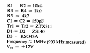 Este circuito foi encontrado num manual de transistores Ferranti de 1974. Os transistores são de uso geral e a frequência é de 1 MHz aproximadamente.