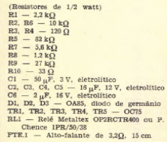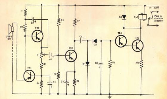 Este circuito foi encontrado numa Eletrônica Popular de 1969. O circuito usa um pequeno alto-falante como microfone. Transistores equivalentes modernos podem ser utilizados.
