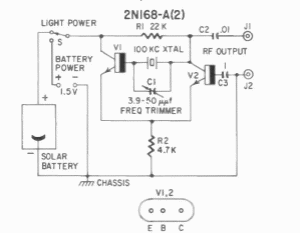 Este circuito alimentado por célula solar gera um sinal padrão de 100 kHz. O circuito é de uma documentação de Gernsback de 1960.