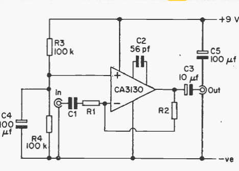 Usando um CA3130 este preamplificador tem excelente ganho. A fonte não precisa ser simétrica. A relação entre R2 e R2 determina o ganho do circuito.