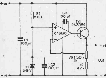 Usando um CA3130 e um transistor de potência, este circuito pode fornecer uma corrente de até 500 mA com o transistor indicado. O circuito é de uma documentação de 1977.