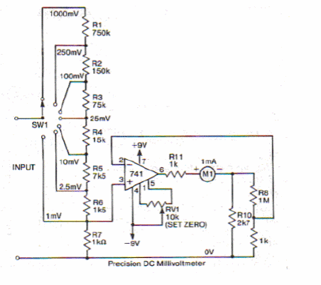 Diversos circuitos semelhantes a este podem ser encontrados em nosso site. Este é de uma documentação da internet. O instrumento tem 1 mA de fundo de escala e a fonte de alimentação é simétrica.