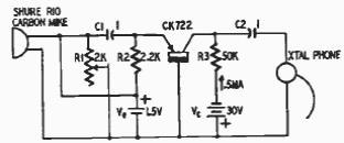 Este circuito para fones magnéticos de alta impedância foi sugerido como amplificador experimental para ajuda auditiva numa publicação sobre transistores de 1954. O microfone é do tipo de carvão, comum na época.