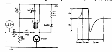 Este oscilador sincronizado por pulsos foi encontrado num manual da Mullard de 1960. Os transistores são de germânio e a frequência dada pelas bobinas e capacitor associado (C2).