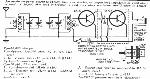 Este receptor AM foi encontrado num manual de circuitos da Raytheon dos anos 60. Os transistores são os primeiros tipos comerciais disponíveis. A saída é em fone de ouvido.