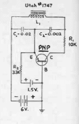 Esta segunda versão de oscilador, encontrada no mesmo manual antigo de circuitos em que encontramos o circuito anterior, se aplica a praticamente qualquer transistor de germânio. Da mesma forma, a frequência é dada pelos capacitores e pelo indutor.