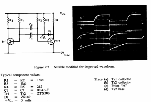Este estável com as formas de onda oscila em 1006 Hz. Encontramos num manual da Ferranti de 1964. Os transistores são de uso geral da época.