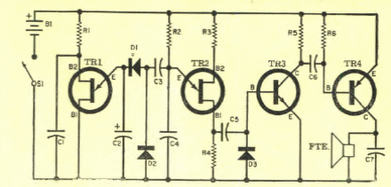 Este circuito de sirene foi encontrado numa Eletrônica Popular de março/abril de 1969. Podemos facilmente fazer sua montagem com componentes equivalentes modernos.