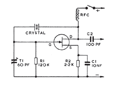 Este circuito pode oscilar em frequências até algumas dezenas de megahertz dependendo do cristal. O transistor pode ser qualquer um de uso geral JFET.