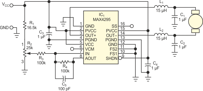 Baseado em documentação da Maxim, este circuito pode controlar um motor usando um circuito integrado de áudio classe D MAX295, O motor pode corrente máxima de alguns amperes. Consulte o datasheet do MAX4295 para mais informações.