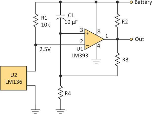 COM base no LM393 ou LM136 da Texas Instruments, este circuito se destina ao monitoramento de baterias de tensões mais alta, chegando a 14 V durante a carga.