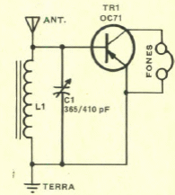 Neste receptor a junção emissor-base do transistor funciona como detector. O transistor é de uso geral e o fone de alta impedância. A alimentação vem do próprio sinal captado.