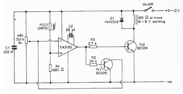 Este circuito usa um sistema de realimentação que trava o relé ao ser fechado. O circuito usa um operacional com FET CA3130 e os transistores podem ser os BC548.