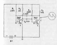 Este astável para transistores de germânio foi encontrado numa publicação de 1956. Pode ser implementado com transistores modernos. Os capacitores determinam a frequência.