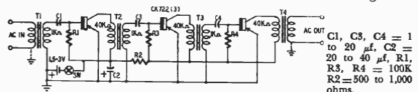 Este circuito é de um livro de transistores de 1954. Os transistores são da época e o ganho obtido é da ordem de 80 dB. Os valores dos componentes são dados ao lado do diagrama.