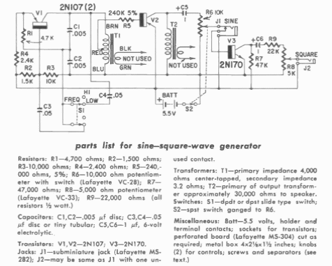 Este circuito foi encontrado numa publicação de Gernsback de 1960. O circuito gera sinais de 420 a 1200 Hz empregando transistores de germânio da época.