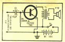 Este microamplificador foi encontrado numa Eletrônica Popular de junho de 1968. Trata-se de um circuito experimental de muito baixa potência. O transformador é do tipo de saída para rádios transistorizados.