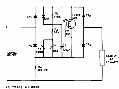 Este circuito foi obtido num manual de SCR da General Electric de 1965. Os componentes são da época.