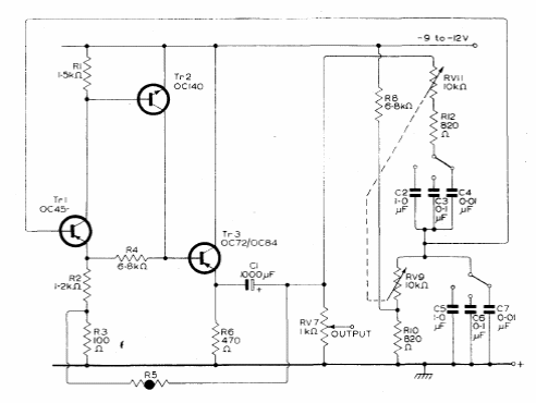 Este oscilador variável foi encontrado num manual de transistores da Mullard de 1960. O resistor R5 é de 100k e os transistores são de germânio da época. As frequências vão de 15 Hz a 20 kHz.