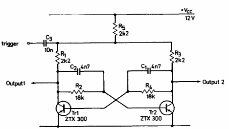Este circuito, para biestáveis lentos foi encontrado no manual de transistores da Ferranti de 1974. Os transistores são de uso geral e a taxa máxima de operação chega aos 50 kHz.