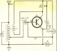 Encontramos este circuito numa Eletrônica Popular de fevereiro de 1967. O transistor pode ser qualquer tipo e L1 é formada por 30 +70 espiras de fio 28. L2 tem 15 espiras. O fone é magnético de alta impedância.