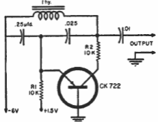 Esta configuração de oscilador de Colpitts foi encontrada no manual de circuitos da Raytheon dos anos 60. A frequência depende do indutor que eventualmente pode ser a bobina de alta impedância de um fone de ouvido.