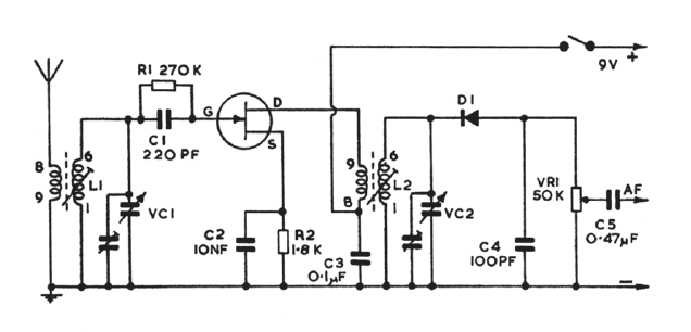 Este circuito de sintonizador foi encontrado numa documentação inglesa antiga. O JFET pode ser qualquer um de uso geral. Dados das bobinas não foram fornecidos.