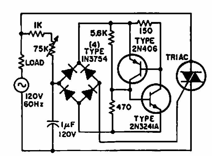 Dois transistores numa chave regenerativa são usados no disparo de um triac. Este circuito é do manual de circuitos de potência da RCA. Os transistores admitem equivalentes.