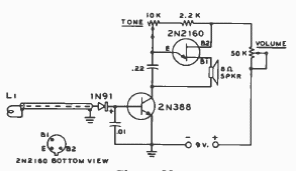 Este monitor de transmissão de telegrafia fornece um sinal a um alto-falante a partir de um oscilador com transistor unijunção. O circuito é de uma publicação de 1977.