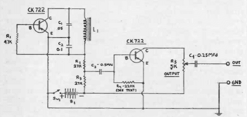 Encontramos este circuito numa documentação americana de 1956. Os transistores são de germânio e a bobina em paralelo com dois capacitores determina a frequência de operação.