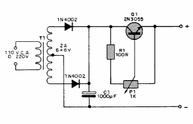 Esta fonte foi originalmente indicada para trabalhos com galvanoplastia, O transformador é de 2 A ou mais. O transistor deve ser dotado de dissipador de calor.