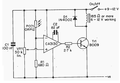 Com um amplificador operacional com FET, este circuito de 1977 usa um LDR como sensor e aciona um relé. O relé deve ser de acordo com a tensão de alimentação.