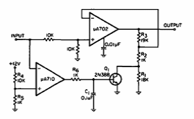Este circuito foi encontrado numa EEE de 1966. Ele se destina à comutação automática da faixa de medidas de um multímetro. Os amplificadores operacionais são da época.